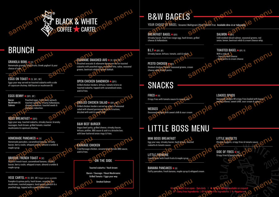 Stores with a full brunch menu generally offer all the classics from a bacon benny to a BOSS breakfast and much more. See the example of a classic B&W brunch menu below: